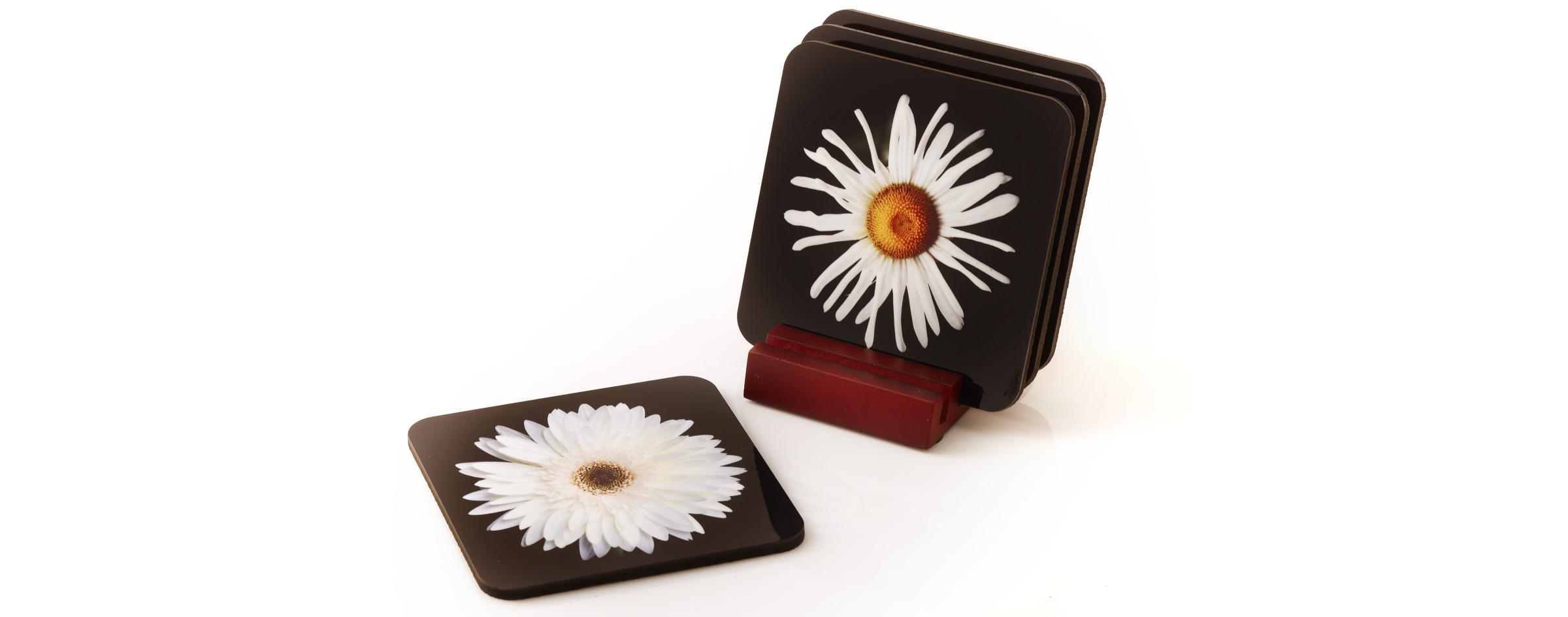 Set of 4 high quality Coasters, with Mahogany display stand can be ordered with images of your choice.